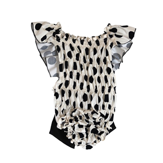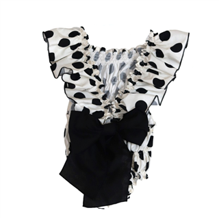 Omschrijving/Materiaal Stroken jurk Ruche met strik Stippel dessin Ritssluiting achterkant Katoen Beige met zwart