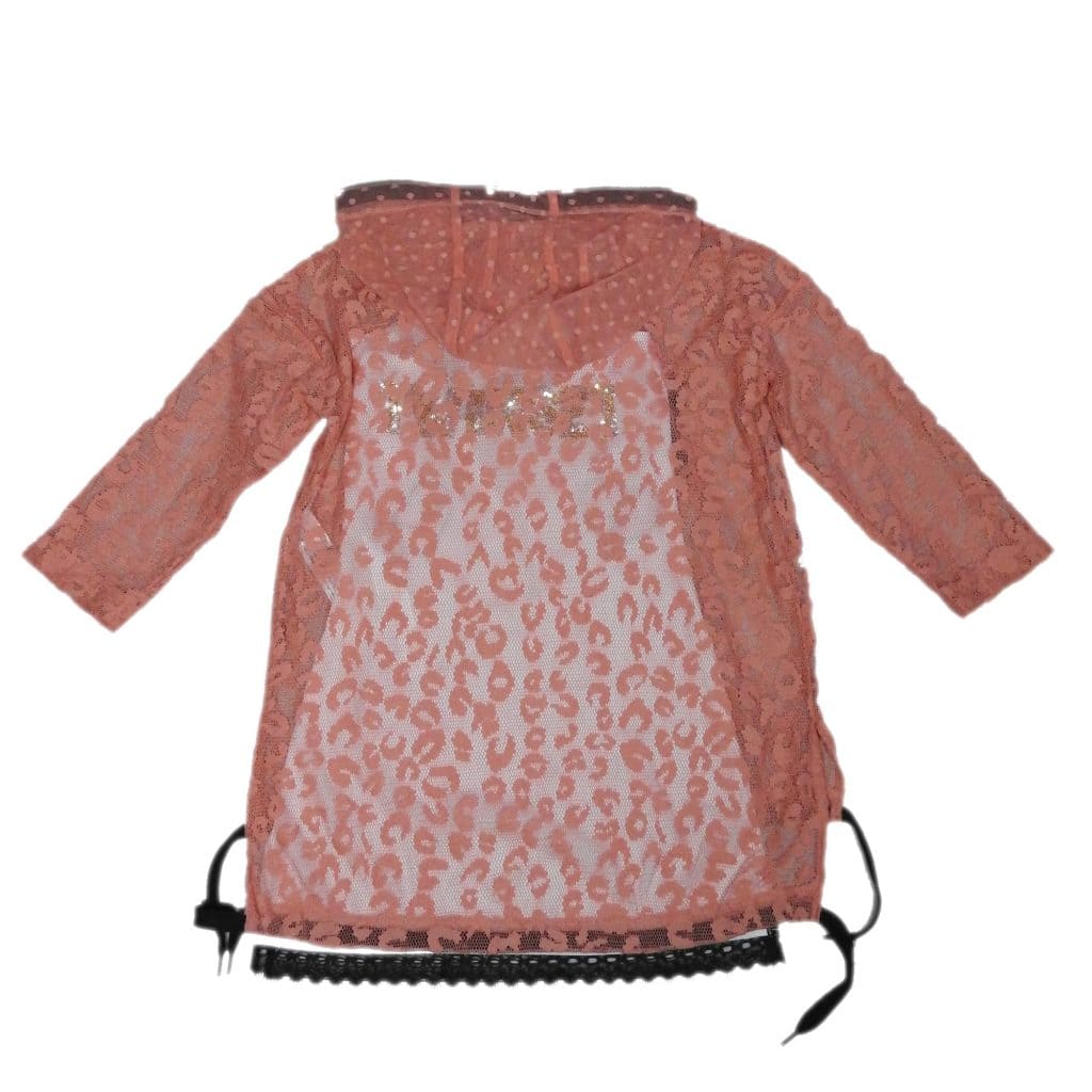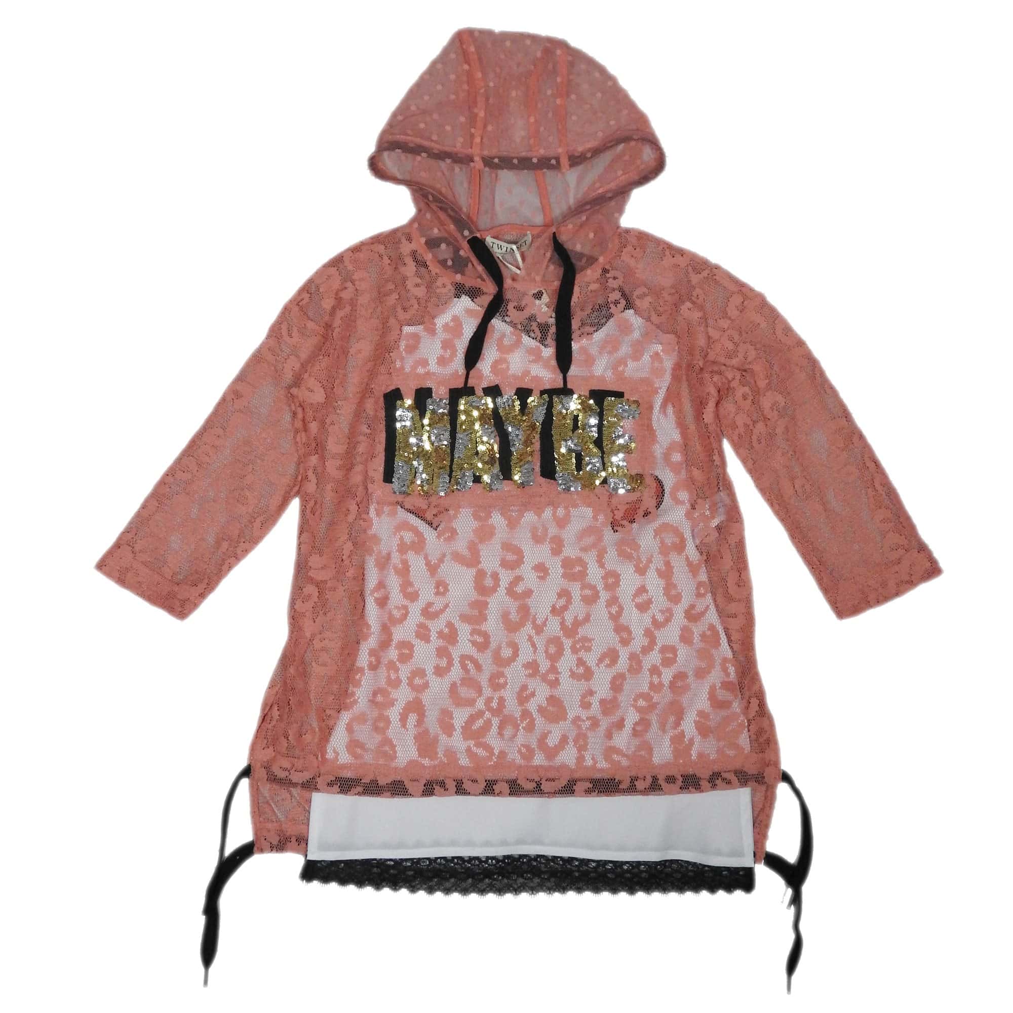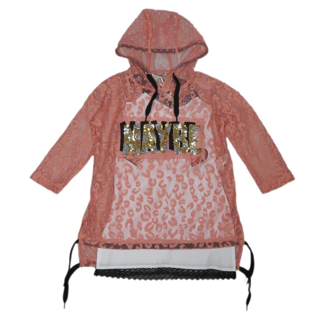 -Overgooier kant met capuchon en tekst MAYBE in pailletten